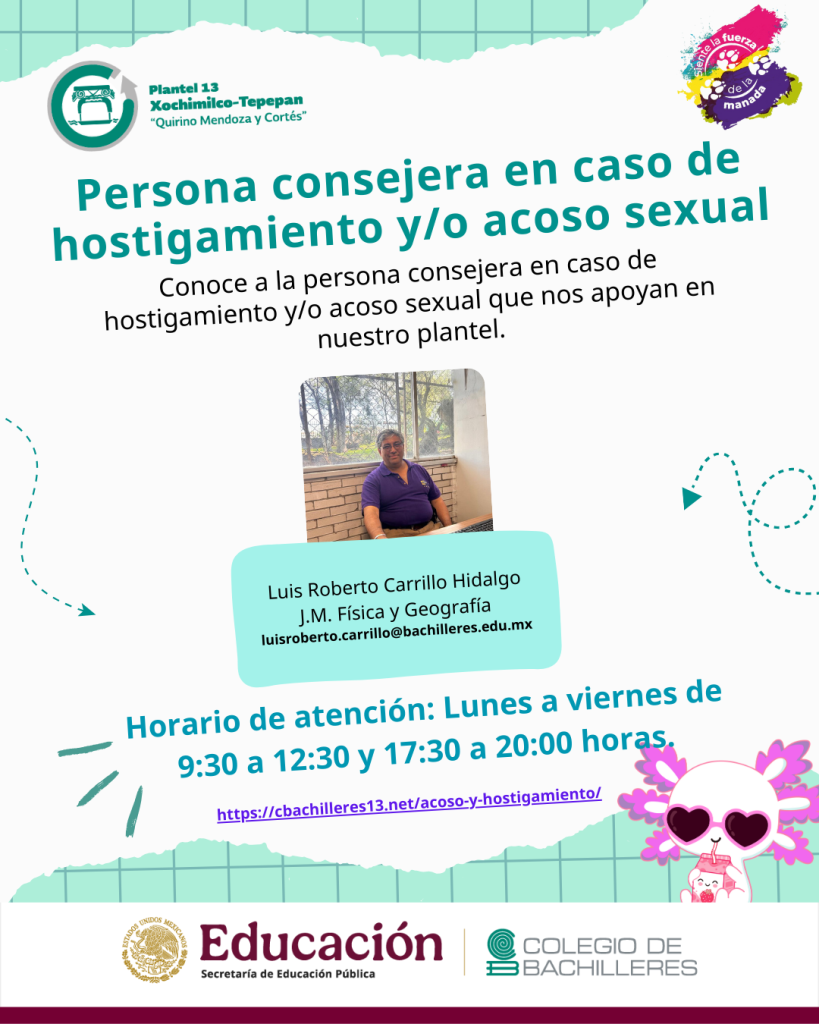 Consejero en caso de acoso y hostigamiento escolar Luis Roberto Carrillo HidalgoJefe de materia de la Academia de Física y Geografía luisroberto.carrillo@bachilleres.edu.mx Atención: Lunes a viernes de 10:30 a 12:30 y 17:30 a 20:30 horas. Procedimiento en caso de acoso escolar Procedimiento en caso de hostigamiento escolar Código de ética de las personas servidoras públicas del Gobierno Federal Código de ética de la administración pública federal