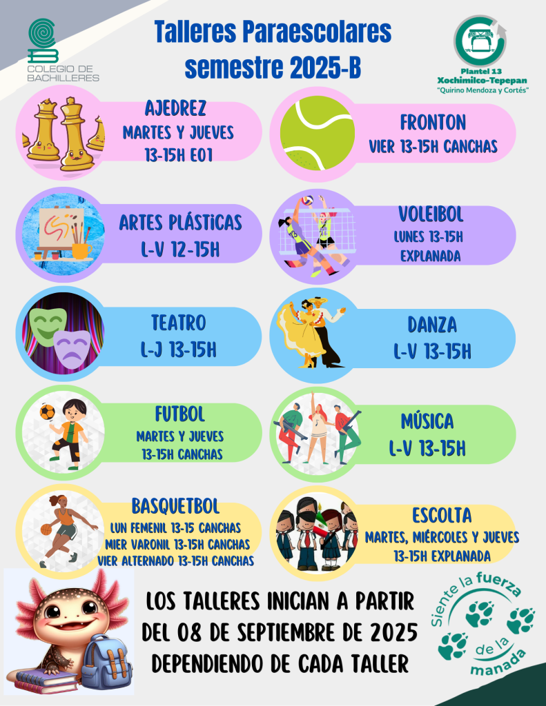 El Colegio de Bachilleres ofrece talleres complementarios, artísticos y deportivos que se llevan a cabo en los horarios de 13:00 a 15:00 horas.
